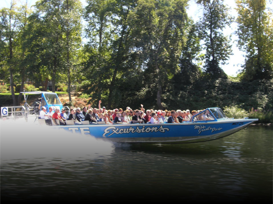 You will glide over the water in a comfortable and safe jet boat. High powered engines turn a impeller